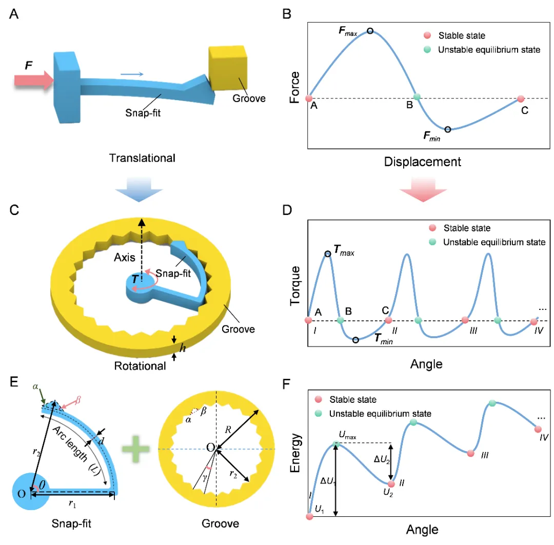 图1 卡扣单元设计及力学特性。(A)平动卡扣结构:悬臂直梁卡扣和卡槽。(B)平动卡扣装配时的力学响应。(C)转动卡扣结构:弧形悬臂梁卡扣和环形卡槽。(D)转动卡扣转动时的力学响应。(E)转动卡扣的尺寸设计,包括卡扣和卡槽的设计参数。(F)转动卡扣转动时的角度-能量关系。