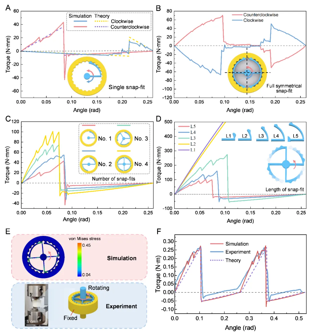 图2 转动卡扣结构的参数分析。(A)单个转动卡扣结构及其力学响应特性(有限元仿真和理论分析)。(B)对称设计的转动卡扣结构及其力学响应特性。(C)转动卡扣数量变化对整体力学性能的具体影响。D)悬臂梁长度对转动卡扣力学性能的影响。(E)转动卡扣的有限元仿真应力分布云图与实际扭转试验的对照图片。(F)有限元仿真、理论分析与实验中转动卡扣力学特性对比分析。