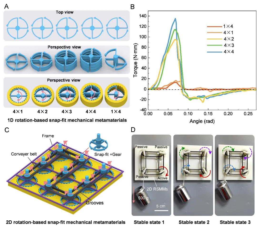 图3 扭转多稳态力学超材料的设计与力学响应。(A)展示了1D转动卡扣超材料的设计方案,具体包含了4×1、4×2、4×3、4×4以及1×4等多种构型配置。(B)1D转动卡扣超材料在不同构型下的力学响应特性。(C)2D转动卡扣超材料的设计原理:集成齿轮结构并利用传送带与特制的带卡槽框架,成功将转动多稳态力学超材料构造成2D阵列结构。(D)2D转动卡扣超材料在图形变换领域的应用潜力。