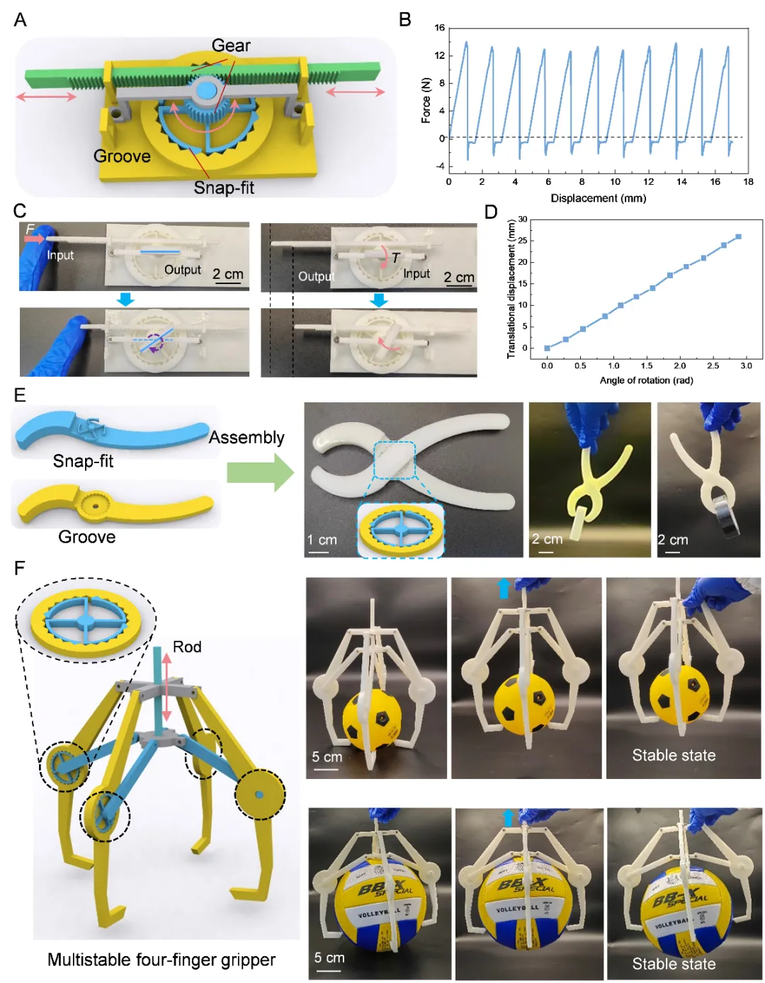 图5 转动多稳态卡扣结构的应用。(A)通过精密设计的齿轮机构,实现了转动多稳态与平动多稳态之间的有效转换机制。(B)转动多稳态向平动多稳态转换过程中的力学响应特性。(C-D)机构平移与转动的转换:(C)机构以平移为输入,转动为输出。(D)机构以转动为输入,平移为输出。(E)基于扭转多稳态原理构建的两指抓手,及其抓取操作的演示实例(橡皮擦和胶带)。(F)基于扭转多稳态的四指抓手设计,及其在实际抓取任务中的应用演示(足球和篮球)。