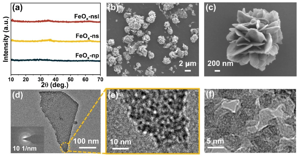 图1. (a)FeOx的XRD图谱;(b-c)FeOx-ns的SEM图像,(d-f) TEM图像(插图:SAED图案)及HRTEM图像。