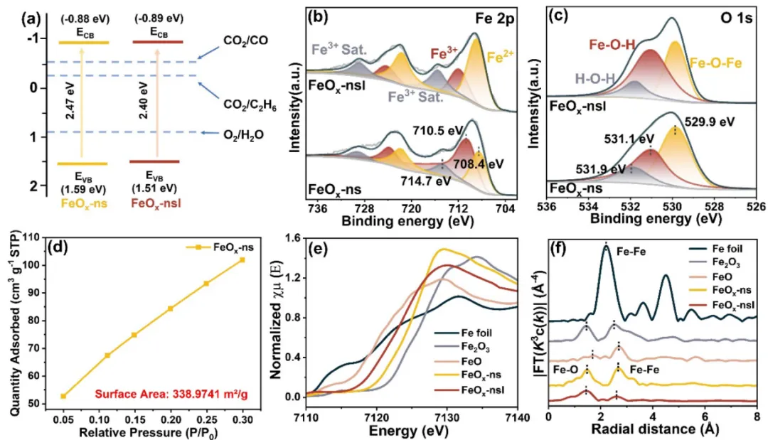 图2. (a)能带位置示意图;(b)Fe 2p和(c)O 1s的XPS谱图;(d)FeOx-ns的氮气吸附等温线;(e)样品的Fe K边XANES谱图;(f) 样品的Fe K边EXAFS谱图的傅里叶变换。