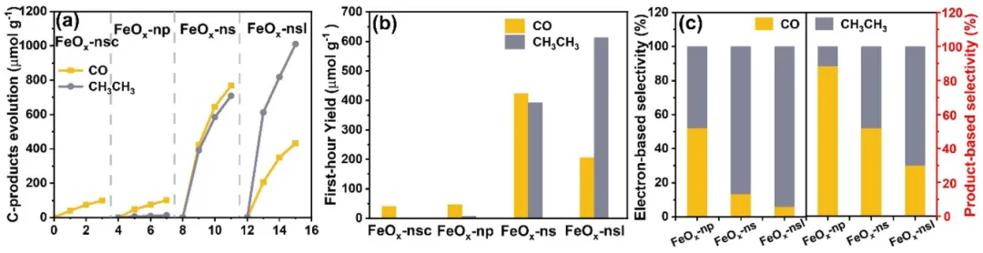 图3. (a)碳产物生成量随时间的变化;(b)FeOx-nsc、FeOx-np、FeOx-ns和FeOx-nsl在第一小时内的光催化活性的对比;(c)FeOx-nsc、FeOx-ns和FeOx-nsl的电子选择性与产率选择性。