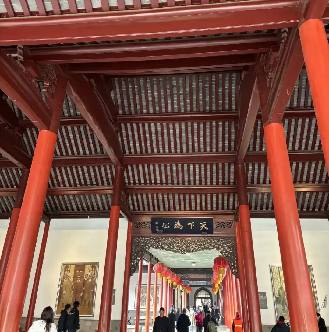 进入大门是原太平天国天王府金龙殿。厅上有孙中山亲书的"天下为公"字匾额。
