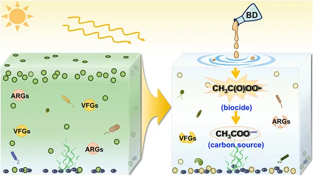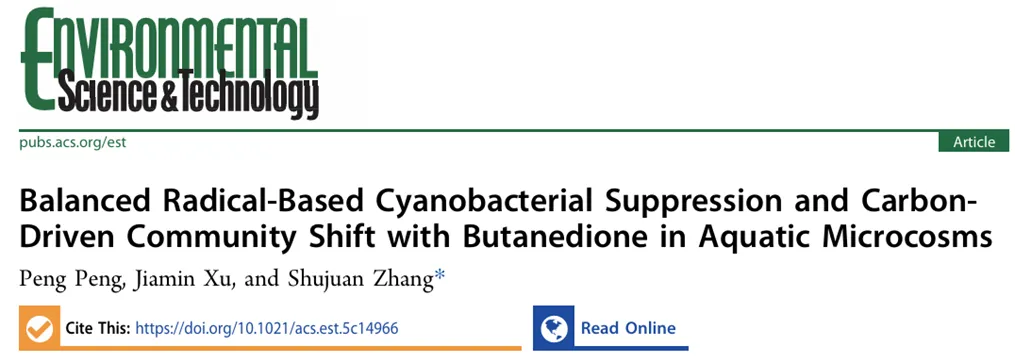 近日,南京大学张淑娟教授课题组在《Environmental Science & Technology》上发表了题为“Balanced Radical-Based Cyanobacterial Suppression and Carbon-Driven Community Shift with Butanedione in Aquatic Microcosms”的研究论文。该研究系统评估了天然化合物——丁二酮(BD)在太阳光驱动下,通过“过氧乙酰自由基高效抑藻”与“乙酸盐驱动群落良性演替”的双效机制,实现有害蓝藻水华的精准控制与水生态健康的协同提升。研究首次解耦了BD光解中间产物(过氧乙酰自由基)与终产物(乙酸盐)的独立生态效应,揭示了BD不仅能快速杀灭蓝藻并降解微囊藻毒素(MC-LR),更能通过抑制群体感应通路,显著降低水体中抗生素抗性基因(ARGs)与毒力因子基因(VFGs)的传播风险。面对全球日益严峻的有害蓝藻水华污染难题,本研究创新性地将一种天然存在、低生物富集性的化合物——BD应用于模拟真实自然水体的微宇宙系统中。研究发现,BD的施加引发了一个独特的串联生态修复过程:在初始阶段,BD光解产生的高活性过氧乙酰自由基作为“生物杀灭剂”,高效抑制蓝藻增殖并将MC-LR降解至世界卫生组织(WHO)规定的安全阈值以下;在后续阶段,其光解终产物乙酸盐作为“可利用碳源”,驱动真核藻的复苏与有益光异养细菌的富集。更为关键的是,宏基因组分析表明,BD衍生的自由基有效破坏了微生物的群体感应和细胞壁合成途径,将同时携带ARGs和VFGs的高风险细菌宿主丰度削减至单纯乙酸盐处理组的五分之一。这些发现为设计兼顾“高效靶向”与“生态安全”的新型控藻技术提供了科学基础。随着气候变化和水体富营养化的加剧,有害蓝藻水华已成为全球性的环境危机。尽管传统化学杀藻剂见效快,但常伴随非靶向毒性、破坏生态群落结构以及引发毒素释放等二次生态风险。在此背景下,利用环境友好的天然小分子进行太阳光驱动的光化学抑藻成为极具前景的替代方案。BD作为广泛存在于植物和大气中的天然物质,在阳光下可发生光解。然而,由BD光解引发的“从强效自由基向营养碳源(乙酸盐)转化”的级联反应,究竟会给复杂的微生态系统带来怎样的净生态结果?其对水体中隐蔽的健康风险(如ARGs和VFGs)有何影响?本研究通过长达26天的微宇宙实验给出了详尽解答。BD的强效抑藻性能与毒素控制