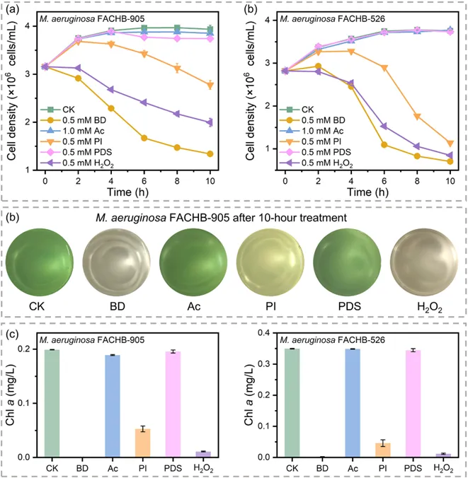 在26天的模拟微宇宙实验中,BD组展现出清晰的两阶段修复轨迹:第一阶段,由自由基主导,水体浊度、生物量和溶解氧迅速下降;第二阶段(第19天后),由乙酸盐驱动,真核藻类开始竞争性生长,溶解氧及生物量良性回升。相比之下,单纯投加乙酸盐(Ac组)全程仅引起微弱的生物量增加,证明早期的强效抑藻与水质改善归功于BD衍生的过氧乙酰自由基。