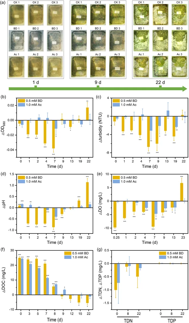 Fig. 3.Performance of BD and Ac in microecosystems. (a) Photos of the three test groups (CK, BD, Ac). (b–g) The changes in water quality parameters: OD680, turbidity, pH, DOC, TDN, TDP, and DO during the experiment, where * denotes P< 0.05, ** P < 0.01, and *** P < 0.001 compared to the control (CK). The significance analysis was conducted for BD and Ac, respectively, against CK.