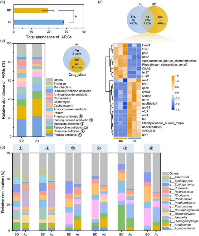 Fig. 4.(a) ARGs detected in both sample groups. (a) The total abundance of all detected ARGs in the BD and Ac groups. Here, * indicates P < 0.05. (b) Distribution and differential analysis of resistance genes at the drug_class level. The left panel shows the relative abundance proportion of the top 15 ARGs types, while the top-right panel illustrates the number of differentially abundant genes at the drug_class level─yellow representing the BD group and blue representing Ac. Significant ARGs are highlighted in the group where they are more abundant. (c) The analysis of differential ARGs at the gene level. The upper part of the figure shows the distribution of differentially ARGs between the two groups, while the lower part presents a heatmap of 24 differential ARGs. (d) The analysis of the top 15 bacterial genera with the highest contributions to the top 6 ARGs at the drug_class level.