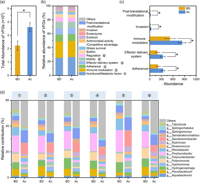 Fig. 5.Distribution of VFGs in the two water samples. (a) The total gene abundance of all detected VFGs in two groups. (b) The compositional distribution of 13 major VFG types based on 587 detected subtypes. (c) Differential VFG types and their gene abundance, with * indicating P < 0.05. (d) The species contribution analysis of 6 major VFG types. Here, the 15 bacterial genera with the highest contribution were selected.BD处理不仅降低了VFGs的总丰度,更在黏附、效应物递送系统等与病原菌定植和感染密切相关的通路表现出显著的抑制作用。结合KEGG通路分析,这主要是因为过氧乙酰自由基破坏了细菌的群体感应信号传导,降低了致病菌的生物膜形成与宿主免疫逃逸能力。高风险宿主的“靶向”清除