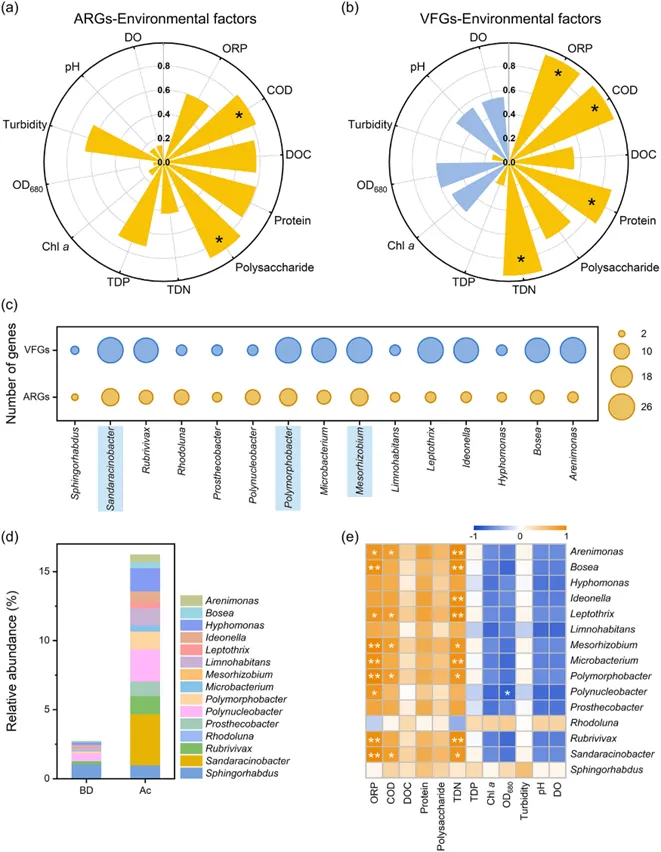Fig. 6. Co-occurrence analysis of ARGs, VFGs, microbial community species, and water quality parameters. The correlation between the overall abundance of ARGs (a) and VFGs (b) with water quality parameters. Here, yellow indicates a positive correlation, while blue represents a negative correlation. (c) The co-occurrence analysis revealed the potential bacterial carriers of ARGs and VFGs (AVBCs) at the genus level. Here, the size of the bubbles represents the number of genes─the larger the bubble, the more genes it carries. The blue bars represent the three AVBCs with the highest number of carried genes. (d) The relative abundance of 15 AVBCs in the BD and Ac groups. (e) Heatmap of correlations between 12 environmental factors and AVBCs. where * denotes P< 0.05 and ** P < 0.01.共现网络分析发现,化学需氧量(COD)是驱动ARGs和VFGs富集的关键共性因子。通过共线分析,识别出15个同时携带多种ARGs和VFGs的高潜在风险细菌属(如Sandaracinobacter和Mesorhizobium)。值得注意的是,BD组中这15类“双毒”宿主的相对总丰度仅为Ac组的1/5。这一结果表明BD在维持水体健康、切断深层生态与公共卫生风险链条方面具有重要作用。这项工作阐明了BD在控制蓝藻水华中的双效机制:从“杀灭性自由基”到“生物可利用碳源”的光化学转化,创造了一个两阶段生态修复过程。BD不仅在初期通过自由基生成实现高效的蓝藻控制和水质改善,更在后期通过碳源驱动微生物群落演替促进生态系统的自我恢复。这一研究为将天然小分子双酮工程化应用于蓝藻水华治理奠定了科学基础。张淑娟:教授、博士生导师,现任职于南京大学环境学院。国家杰出青年科学基金、优秀青年科学基金获得者。先后入选教育部"新世纪优秀人才支持计划"、江苏省"双创人才引进计划"、江苏省"六大人才高峰支持计划"、国家自然科学基金"优秀青年科学基金"、南京大学"登峰人才支持计划"。主要研究方向包括环境功能材料和高级氧化还原技术,提出并系统研究了基于小分子双酮的水污染控制化学。彭芃:南京大学环境学院博士研究生,研究方向为小分子双酮介导的有害藻华控制研究。以第一作者在Environmental Science & Technology、Science of The Total Environment期刊发表SCI论文2篇。Peng, P.; Xu, J. M.; Zhang, S. J. Balanced Radical-Based Cyanobacterial Suppression and Carbon-Driven Community Shift with Butanedione in Aquatic Microcosms. Environ. Sci. Technol. 2026https://pubs.acs.org/doi/10.1021/acs.est.5c14966