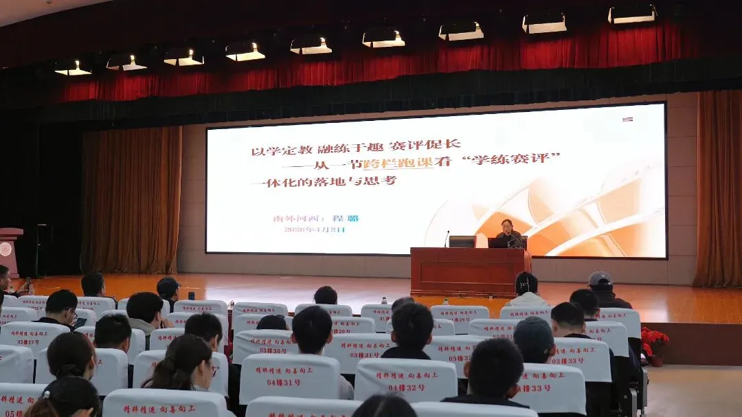 南京市建邺高级中学始终高度重视体育育人工作,为本次教研活动的顺利开展提供了有力保障与优质支持。活动伊始,众人齐聚南京市建邺高级中学青春剧场报告厅,开启本次教研之旅。首场专题讲座中,南京外国语学校河西初级中学程璐老师以《以学定教 融练于趣 赛评促长——从一节经典跨栏跑课看“学练赛评”一体化的落地与思考》为题,结合自身课例拆解“学练赛评”一体化的实践逻辑,为一线教师提供了可复制的教学范式。“打破传统分解教学模式,确立‘先完整体验,后细化精雕’的思路,让学生在体验中建立信心,逐步掌握技术。”程璐说道。