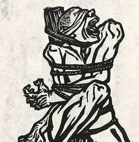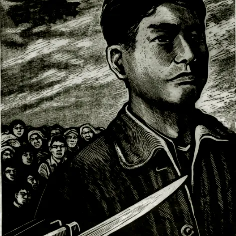 红馆中聚焦陈然烈士就义前场景的版画,以黑白木刻特有的刚劲线条,将烈士的刚毅与不屈定格永恒:他身着囚服,铁镣在脚下沉重作响,目光却如炬般坚定,嘴角噙着对敌人的蔑视、对革命胜利的憧憬,恰如《我的自白书》中“对着死亡我放声大笑”的凛然气魄。背景里,无数群众簇拥凝视,眼神中饱含敬仰与不舍,隐约可见的带刺刀枪械,直白揭示了“中美合作所”集中营的残酷环境。艺术家以刀代笔,将文字无法穷尽的悲壮与坚毅,浓缩在深浅不一的刻痕中,强烈的黑白对比直击心灵——曾经在课本上反复诵读的诗句,此刻通过刀锋的温度、画面的力量,化作可触摸、可感知的精神具象。