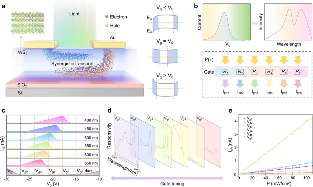 图1-单器件肖特基结计算光谱仪的工作原理:图1主要建立了该单像素微型光谱仪的基本物理框架。器件采用Au/WS₂/Au背靠背肖特基结结构,在光照和栅压共同作用下,通过调制Au/WS₂界面肖特基势垒,实现明显的反双极输运特征。图中给出的流程表明,器件首先通过单色光逐波长标定得到光谱响应矩阵,随后再利用未知光源在不同栅压下的光电流响应反演其光谱分布。其核心在于,不同波长对应的转移曲线峰位和形状均随栅压发生系统变化,从而形成具有高度非线性的二维响应空间,为后续高精度光谱重构提供了物理基础。与此同时,器件在特定栅压下对入射光强保持良好的线性响应,说明该结构不仅具备波长分辨能力,也具备较好的动态测量稳定性。