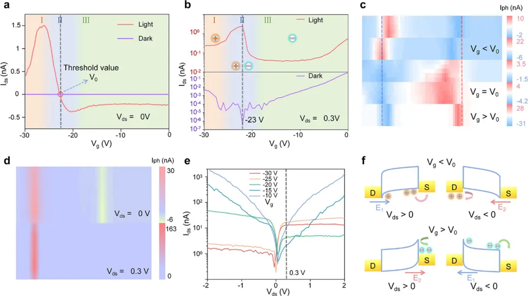 图2-栅压调控肖特基势垒的物理机制:图2进一步揭示了器件实现波长可分辨光响应的内在机制。零偏压下的转移特性显示,光电流会在特定栅压处发生极性反转,表明栅压调控已足以重构载流子的主导输运类型;而在小源漏偏压下,器件可分为以空穴主导、电子—空穴协同以及电子主导的三个输运区间,其中反双极峰值与暗电流极小值出现在相近栅压范围,说明该处界面势垒最有利于光生载流子分离而最不利于暗态载流子注入。空间分辨光电流映射进一步表明,光响应主要起源于金属/半导体接触区,直接验证了器件工作机制来源于背靠背肖特基结而非均匀沟道本体。结合输出特性和能带示意图可以看出,栅压通过调节WS₂费米能级位置改变两侧接触势垒的相对关系,从而驱动整流方向、短路电流极性以及反双极峰位置的演化。该图实质上说明,栅压可调肖特基势垒是单器件实现光谱编码的关键。