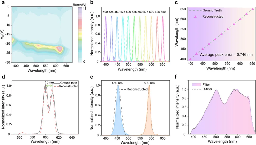 图3-光谱重构性能验证:图3主要展示该单像素光谱仪在光谱重构任务中的性能。器件的响应矩阵在波长和栅压两个维度上呈现出清晰而复杂的非线性纹理,这意味着不同波长对应不同的电响应特征,可用于建立可逆映射关系。在此基础上,器件对多组窄带单色光的重构结果与商用光谱仪测得的真实光谱高度吻合,峰位平均误差仅约0.746 nm,显示出较高的单色重构精度;对于双峰分辨测试,其光谱分辨率可达到10 nm以内。进一步地,无论是双峰LED光源还是宽带光源,器件的重构结果都能较好复现真实谱线形貌,表明其不仅适用于单色识别,也具备对复杂连续光谱进行稳定重建的能力。该图说明,该器件在极小尺寸下已经实现了兼顾高精度和可见光宽谱段工作的单像素计算光谱探测。