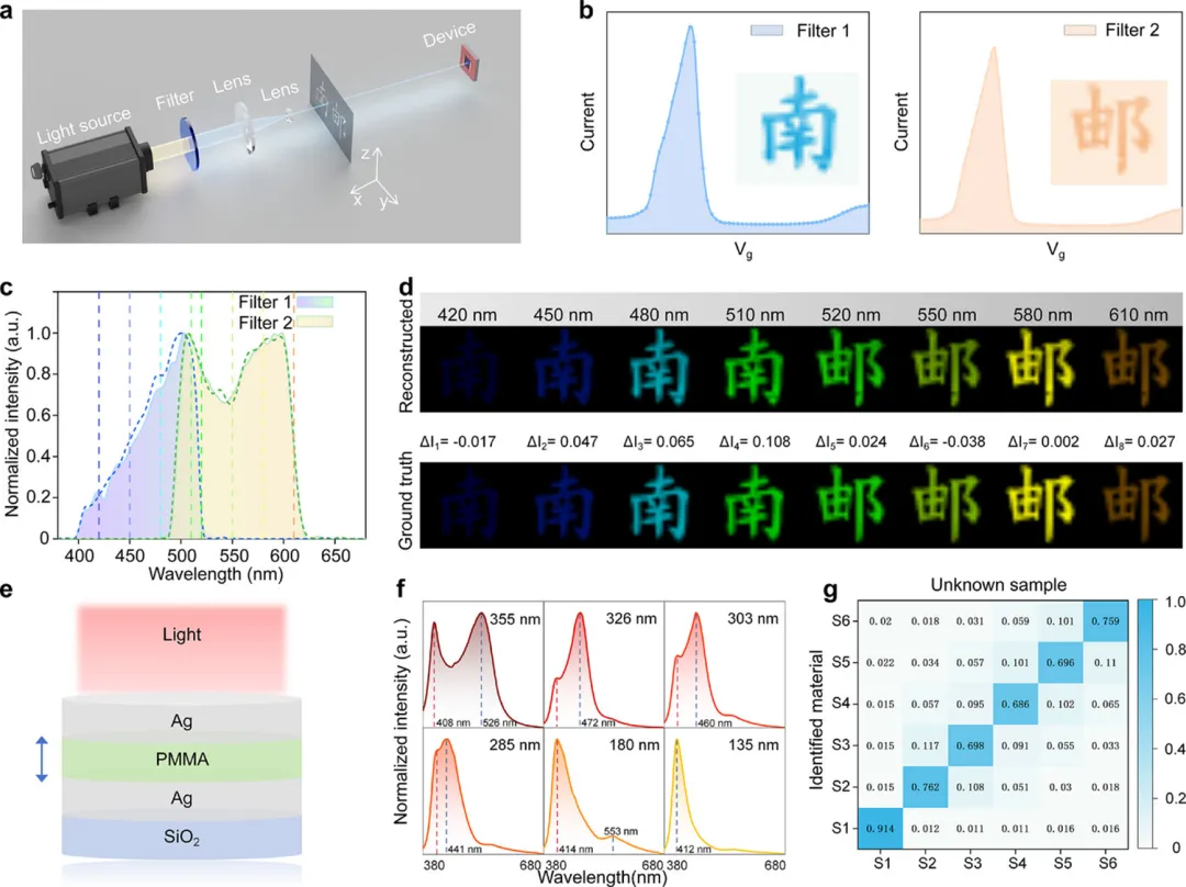 图4-高光谱成像与材料识别应用演示:图4将器件性能进一步扩展到实际应用层面,验证其在高光谱成像和材料分类中的可行性。图中首先构建了一个空间扫描式高光谱成像系统,通过预先确定目标谱段对应的最佳响应栅压,再在固定栅压下逐点扫描目标图案,实现特定波长信息的空间成像。结果表明,器件对不同带通滤光条件下目标图案的成像结果与商用光谱系统获得的参考图像具有较好一致性,说明该单像素器件已能够完成从“光谱识别”到“光谱成像”的功能拓展。进一步地,作者构建了不同PMMA厚度的多层薄膜样品,并基于重构光谱与参考谱线之间的相似性完成材料分类,所得平均识别准确率达到70.3%,显著高于随机猜测水平。该图表明,这种基于肖特基势垒调制的二维微型光谱仪不仅能够进行高精度谱线重建,也具备面向高光谱成像和材料分析的实际应用潜力。