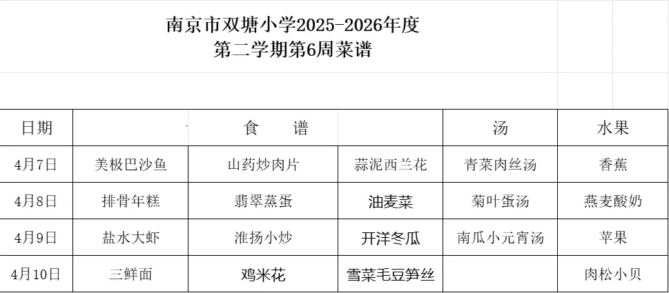 南京市双塘小学2025-2026年度 第二学期第6周菜谱