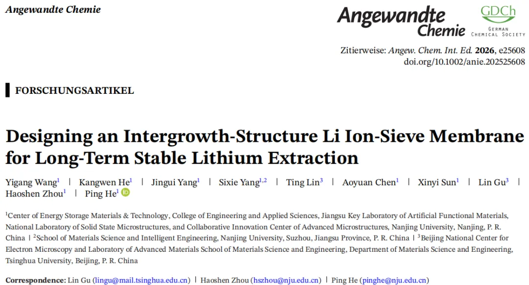 本研究证明,在化学稳定保护层与 NASICON 型锂离子筛膜间构筑晶格匹配共生界面,可同步提升膜的化学稳定性、力学完整性与Li+传输性能。所提出的渗透生长法为构筑共生结构锂离子筛膜提供通用可扩展路径,为海水及低品位卤水长效提锂提供理想技术方案。