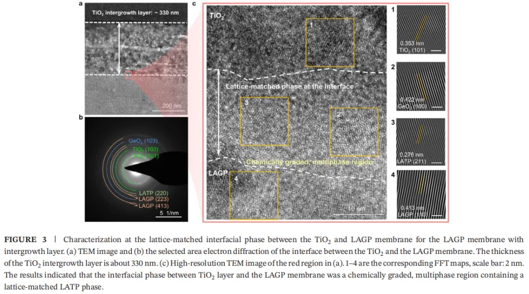 为揭示带共生层 LAGP 膜高稳定性与高离子电导率的根源,对TiO2与 LAGP 膜间的晶格匹配界面相进行深入表征。带共生层 LAGP 膜厚度为 0.85 mm,TiO2共生层厚度约 330 nm。选区电子衍射(SAED)图谱证实界面处存在 LATP 相,该相Li+导电性良好,可构建连续Li+传输通道。高分辨透射电子显微镜(HRTEM)测试显示,界面区域可标定出TiO2(101)晶面、LAGP(110)晶面,同时存在LATP与GeO2晶面,证明界面为TiO2、LATP、LAGP、GeO2组成的混合多相区。
