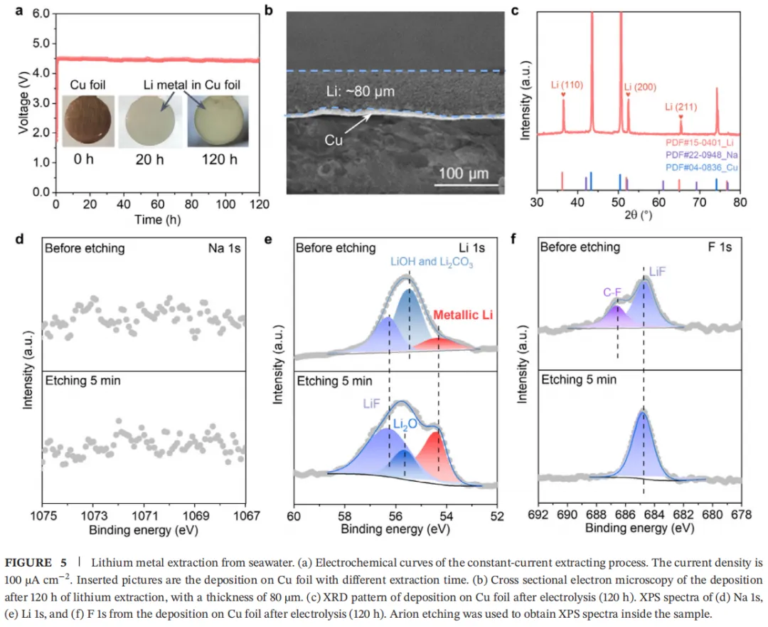 晶格匹配界面相的形成机理:TiO2溶胶中的乙酸刻蚀LAGP膜表面形成酸刻蚀层;后续烧结过程中,刻蚀表面发生界面重构,Ti4+扩散进入 LAGP晶格并与Ge4+交换生成LATP;因LATP与LAGP同属 NASICON 结构,烧结后形成晶格匹配界面相。该界面相使膜兼具高硬度、高界面剥离强度与连续Li+传输通道,实现海水环境下的高化学稳定性与高离子电导率。实验所用海水取自中国辽宁葫芦岛,分析了海水中Li+及主要干扰阳离子浓度。将带共生层 LAGP 膜组装成提锂装置,以含5wt% FEC 的 0.1 M LiClO4碳酸丙烯酯(PC)溶液为有机电解液,采用两电极体系进行电化学测试。在100μA⋅cm−2恒流密度下,电解池平均电压稳定在4.51 V,铜箔表面逐渐形成金属灰色沉积物。电解120小时后,铜箔上沉积层厚度约80 µm,质量约3.03 mg;此过程库仑效率 97.4%,能耗17.4 kWh⋅kg−1。