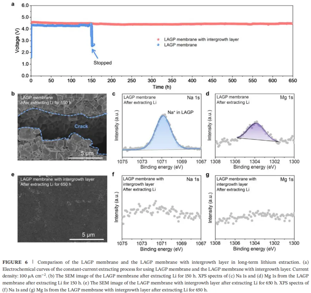 进一步探究阳极反应与速率控制步骤:质谱与碘量滴定表明,电解过程中阳极OER占比略高于ClER。阻抗测试、弛豫时间分布(DRT)与直流极化测试显示,海水提锂体系总阻抗为 1.86 kΩ,Li+浓度升高可降低体系阻抗;0.1–1 s 与 1–10 s 时间尺度的弛豫峰显著,证明扩散为动力学速率控制步骤,Li+浓度主要影响液相扩散与膜传输阻力。综上,提锂过程速率控制步骤为海水边界层内Li+扩散及跨 LAGP 膜传输。对比纯LAGP膜与带共生层LAGP膜的提锂长效稳定性:纯LAGP膜在100 μA⋅cm−2下初始电压约4.35 V,120小时后电压波动,150小时骤降至~2.5 V,膜失效;SEM 显示膜表面出现明显微裂纹,XPS检测到 Na、Mg 信号,证明发生严重离子交换与化学腐蚀,无法有效提锂。