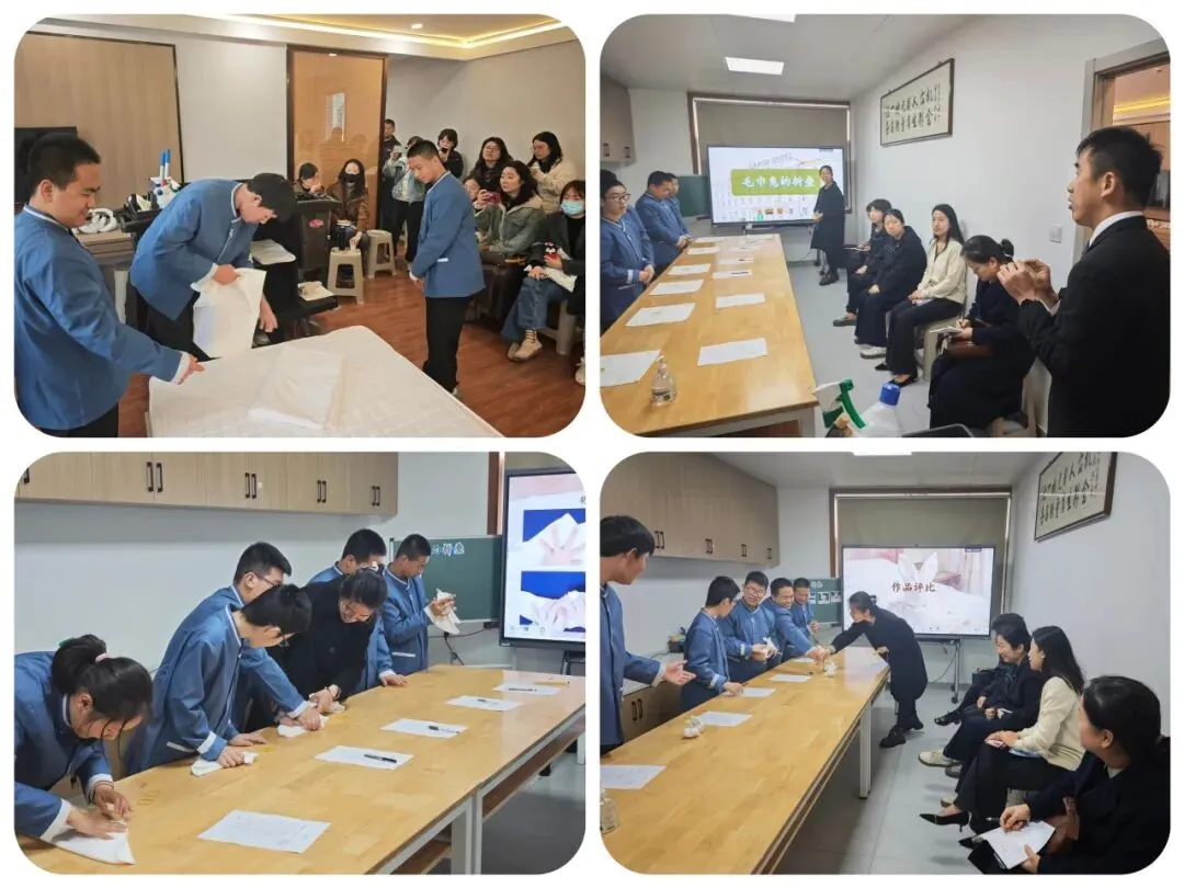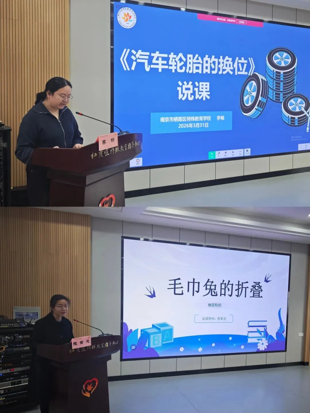课例展示结束后,活动进入说课研讨环节。两位授课教师分别从教材分析、学情研判、教学目标、重难点、教学流程及课后反思等方面进行说课,重点呈现了分层教学、实操实训与职业素养渗透的设计思路。