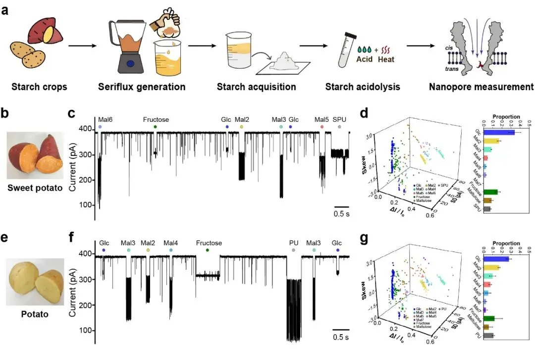 基于孔道的高分辨能力,作者以红薯和土豆作物为例,直接从中提取淀粉并对酸解产物分析(图2)。使用单类支持向量机算法和机器学习,可以从红薯和土豆的酸解产物中识别出麦芽低聚糖信息以及果糖和麦芽酮糖。通过文献调研和实验,验证了果糖和麦芽酮糖由于热异构化形成。同时还存在一些未识别的事件簇,可作为样品特有的结构特征信息,构成了样品的特征指纹谱。该技术提供了一种快速、便携、无标记且高分辨的聚糖分析方法,凸显了纳米孔技术在食品化学和糖组学分析中的应用潜力。