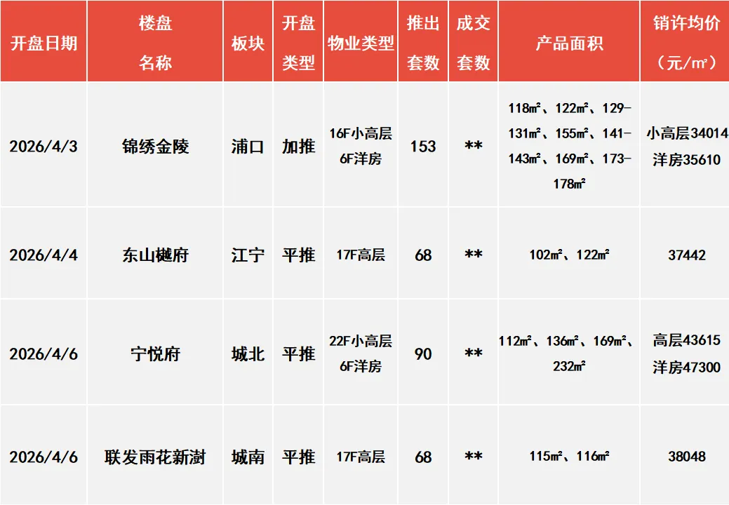 上周(含清明假期)4盘新推,共计推出379套,整体去化率约50.4%,去化率较前期大幅度上涨,主要得益于江核红盘锦绣金陵,该项目3月25日首开推出18套房源试水,百分百去化,清明假期期间分两批次加推153套房源,此次加推延续首开优惠,综合优惠7折,送三十万软装包+1万买车位,同时该项目从去年11月份开始蓄水,此次加推仍有前期客户基础,因此开盘去化率超95%。