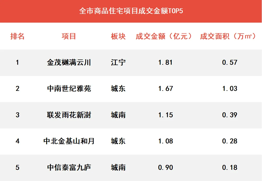 上周各板块表现中,城东板块因为中南世纪雅苑项目单项目支撑共计成交162套,断崖式领先其他区板块;江宁板块以117套位列次席,主力成交项目为金茂樾满云川、联发云启等,其他板块除城南板块92套外,成交量则均在60套以内。