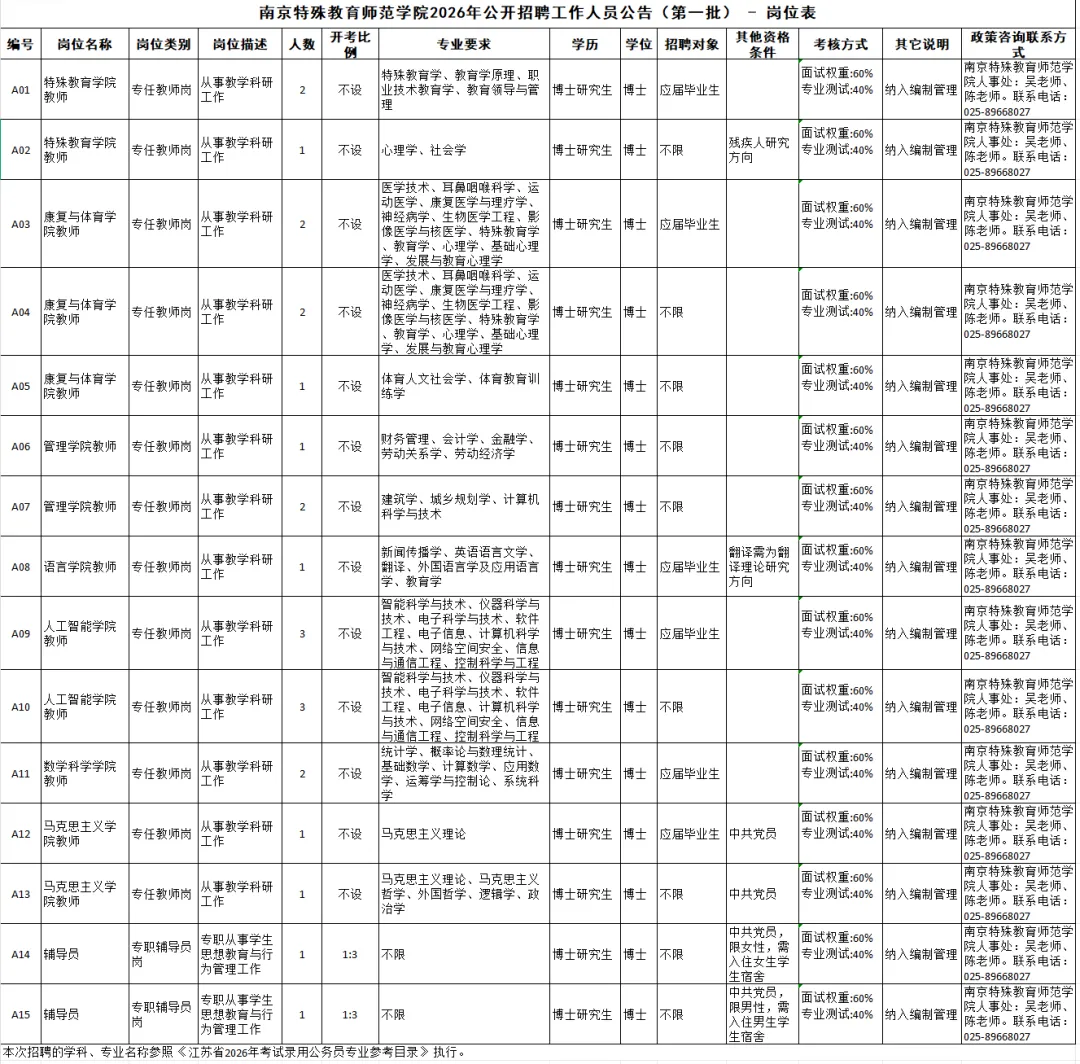 附件:南京特殊教育师范学院2026年公开招聘工作人员公告(第一批)-岗位表.xlsx