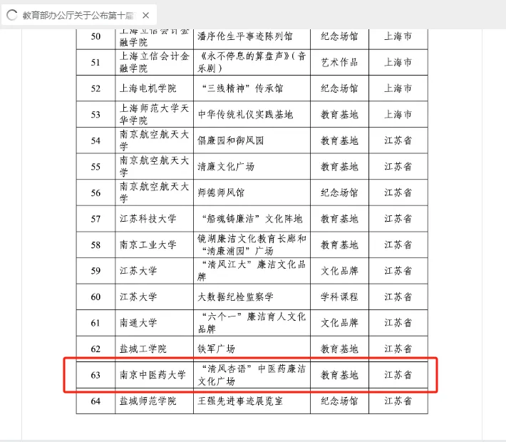 日前,教育部办公厅印发《关于公布第十届高校廉洁教育系列活动结果的通知》(教思政厅函〔2026〕5号)。其中,南京中医药大学申报的“清风杏语”中医药廉洁文化广场入围“传廉促担当”廉洁文化地图素材遴选名单,类别为教育基地,充分彰显了学校廉洁文化建设成效。