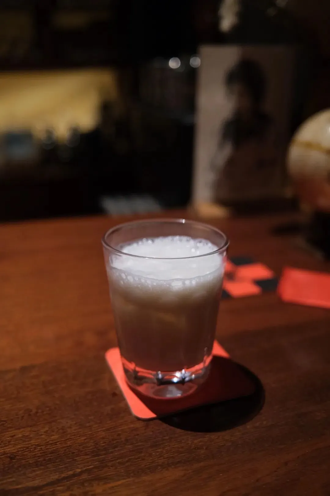 。松井桑的棕色烈酒shake用时很短,动作也看起来非常轻柔,但出品却出乎意料的漂亮。整杯酒的果汁感极强,有着极新鲜的柑橘香气。在尾部,朗姆带来了不算多的酒精强度和热带果香,是很有喝酒实感的一杯。酒过三巡,决定整点花活。给松井桑看了Mosquito的配方,他大概是第一次做。松井桑用姜汁利口酒替代了姜糖浆,用盐粒替代了原配方的盐水,但出品依旧好喝。融合度非常高,姜和微弱烟熏压制了甜感,金巴利带来的苦味给酒带去了清爽的微弱变化。最后端上来了一杯Courvoisier VSOP干邑白兰地、Frangelico榛子利口酒和奶油(或许还有牛奶)组合的亚历山大变体(大概?)。