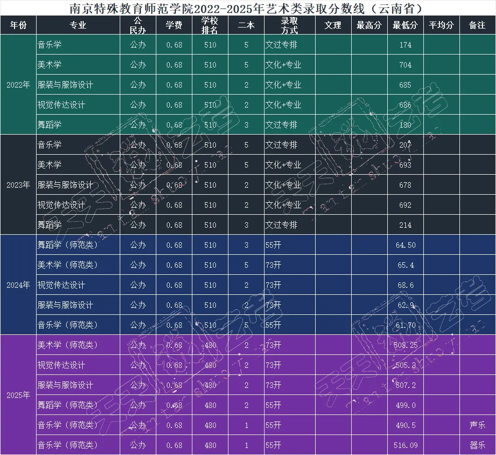 南京特殊教育师范学院艺术类招生专业有环境设计、美术学、音乐学、音乐治疗、舞蹈学、视觉传达设计和服装与服饰设计。近年在云南招生的专业音乐学、美术学、舞蹈学、视觉传达设计和服装与服饰设计,录取分数线如下: