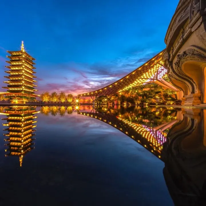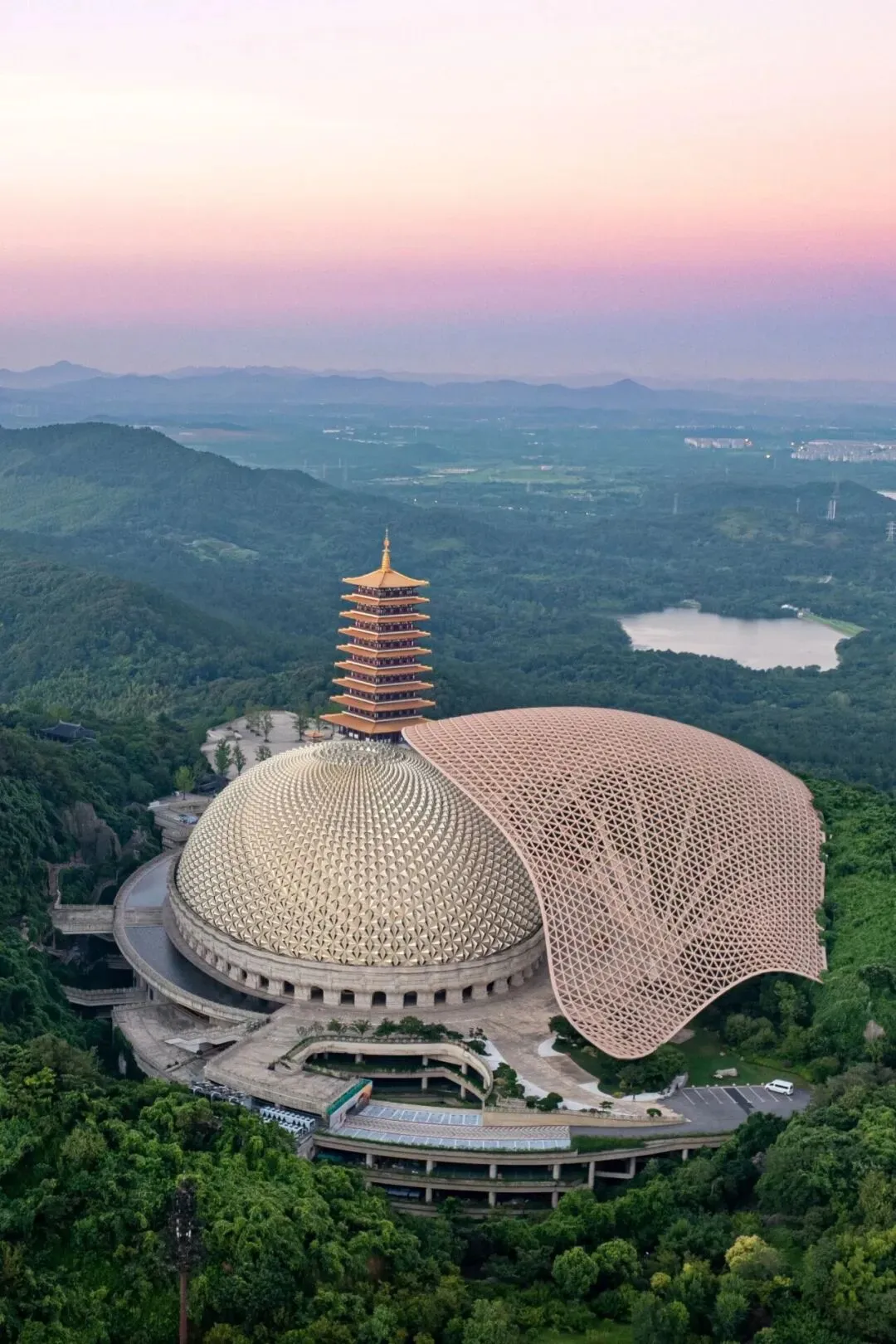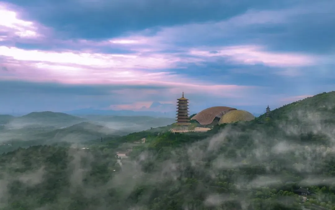 废弃矿坑之上的佛顶宫,以“补天阙、藏地宫”的精妙巧思,将生态修复与建筑艺术完美融合,重现牛首双峰天然盛景,一举斩获鲁班奖、詹天佑奖两大殊荣。88米的佛顶塔,九层八面的唐风设计与弘觉寺塔(唐代)遥相呼应。