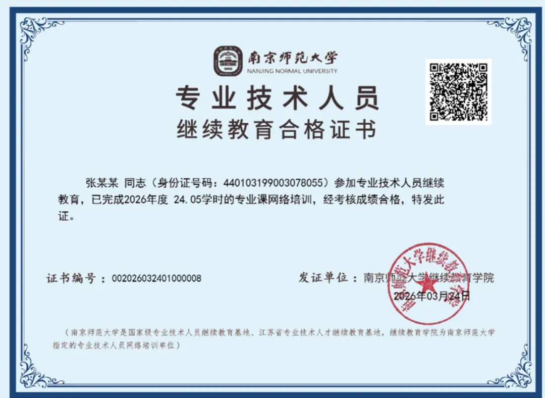 参训学员可登录南京师范大学专业技术人员继续教育培训平台(网址:https://jdjy.njnu.edu.cn/),在线完成报名注册、课程选购、费用缴纳、线上学习及考核测试等全流程操作,考核合格后,可在线申请并下载电子合格证书。证书样式如下图: