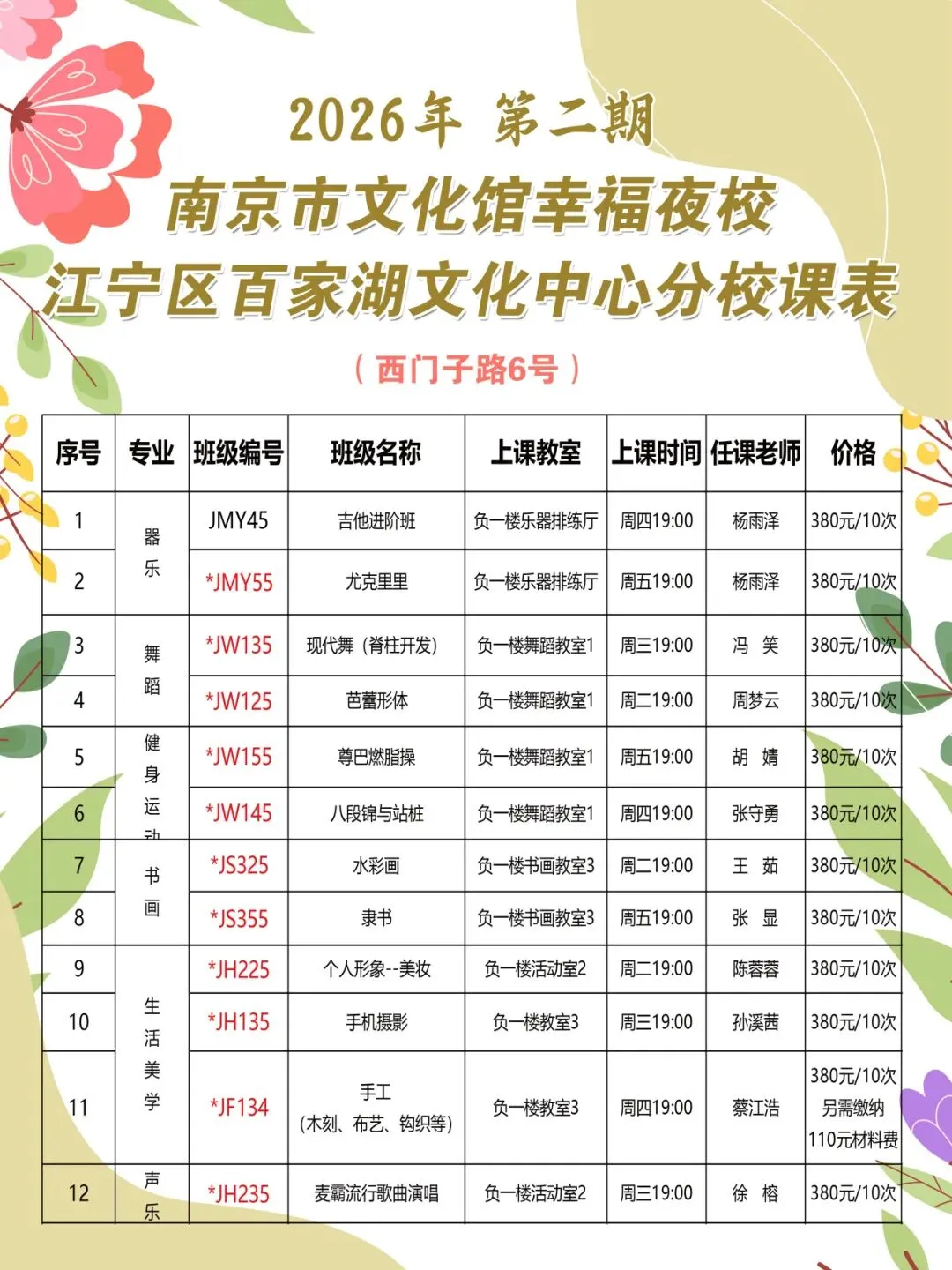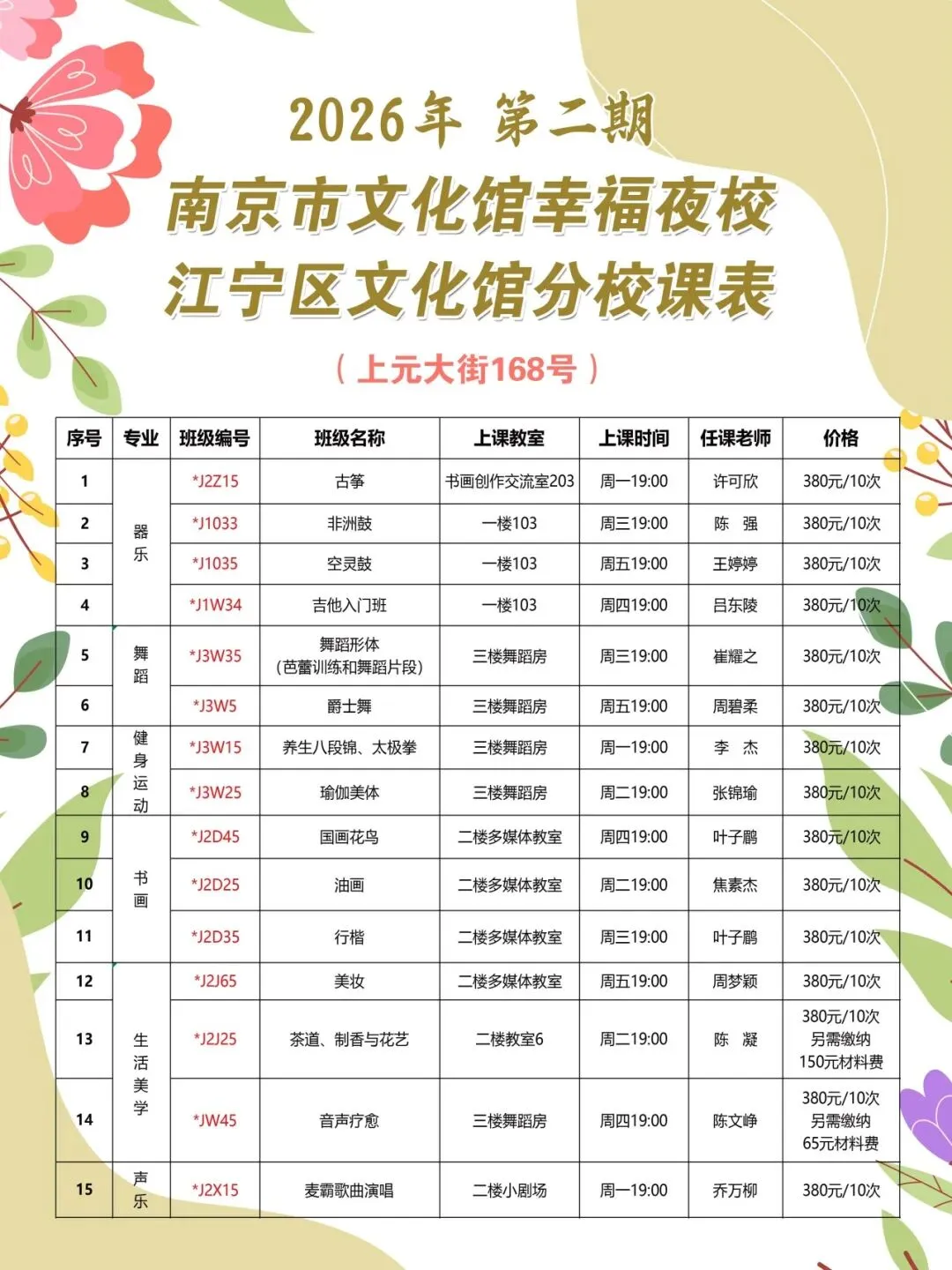 3、备注:除学费外,以下课程另需自备学习用品/缴纳相应材料费于第一次开课时交给任课老师:①【茶道、制香与花艺】课程另需缴纳150元材料费并自备小茶盅 。②【音声疗愈】课程另需缴纳65元材料费。③【非洲鼓、吉他、尤克里里】课程请自备乐器,或第一次课时咨询任课老师购买。 ④【手工(木刻、布艺、钩织】课程另需缴纳110元材料费。⑤【养生八段锦、太极拳、爵士舞、芭蕾形体、尊巴燃脂操、瑜伽美体、舞蹈形体、八段经与站桩】课程自备运动服、运动鞋 。⑥【水彩画】课程自备水彩颜料、水彩纸、水彩用笔、勾线笔、勾线墨水、铅笔橡皮、高光。 ⑦【隶书】课程请自备毛笔(出锋4厘米左右)、兼毫墨汁、毛边纸、书法作品纸(五言七言即可)、毛毡等。⑧【国画花鸟】课程请自备半生熟宣纸(练习用)33X33半生熟宣卡纸(硬的)、白云笔、大中小号兼毫毛笔、国画颜料、勾线笔、毛毡、墨汁、多个碟盘等。⑨【油画】课程自备丙烯套装颜料盒36/42色均可,调色纸、画笔一套、洗笔桶30cmX40cm棉布画框。⑩【行楷】课程自备书法米字格练字纸、新年红纸、书法作品纸、墨汁、大中小号兼毫毛笔、毛毡、墨盘。⑪【美妆】课程自备彩妆用品(自己原有的彩妆及工具即可)。⑫【舞蹈形体(芭蕾训练和舞蹈片段)】需自备软底鞋和衣服。⑬【现代舞(脊柱开发】课程需自备舒适衣服、软底鞋或现代舞袜。⑭【麦霸歌曲演唱】课程需自备一次性长吸管和矿泉水瓶 。⑮【古筝】课程请自备古筝指甲。
