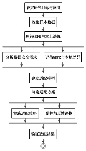 本研究拟定了南京都市圈跨境数据流动的合规范式,并重点探讨了GDPR的本土化适配机制。在GDPR适配框架分析阶段,我们设定了研究目标与范围,并收集了相关样本数据,确保数据具有代表性和可靠性。研究的首要步骤是深入理解GDPR法规和本土法规,确保其能够适用于南京都市圈的实际数据跨境需求。在此基础上,研究通过图3-1工程数据安全与GDPR配适性研究框架展开系统分析。