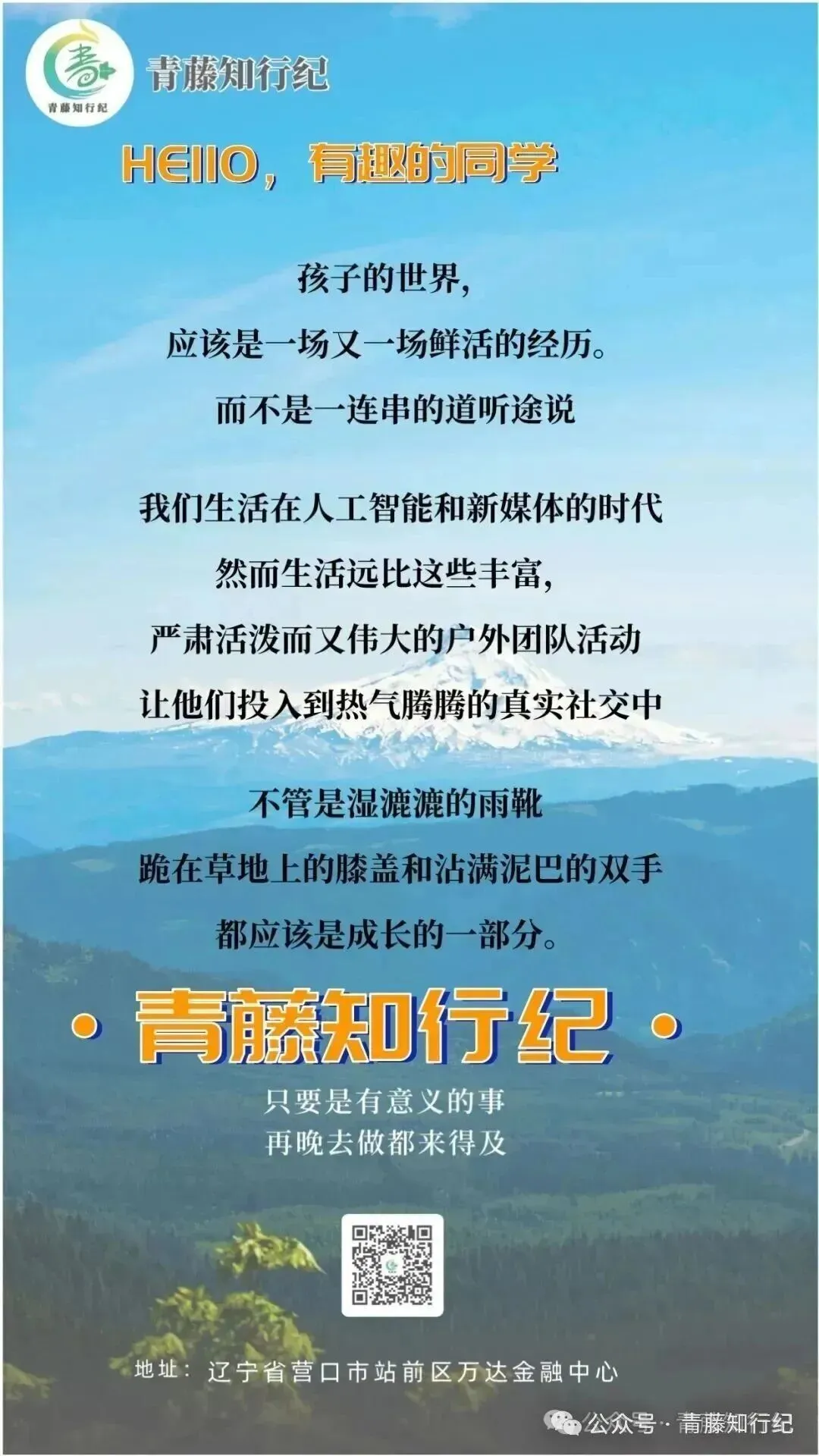 青藤知行纪--营口国之旅分公司涵盖了青少年多元体验式、户外拓展式活动、社区自然教育、组织文化艺术交流、国内外文史精讲,萤火益童盟军事及营地联动/亲子遛娃公社/蚂蚁力量儿童义工团/营口市志愿者协会志愿者服务,我们专业从事各类户外亲子体验式游学活动,举办各类适合孩子们的游学活动,包括自然教育、科普农事教育、成人拓展团建、公益教育助力童年、青少年独立一日及多日营,北京,上海,山东,西安自主研发深度研学课程,委托当地最优质的旅行资源及正规导师,旅行社专线旅游咨询等活动,深受孩子们和家长的喜爱及好评。我们的宗旨是纸上得来终觉浅,绝知此事要躬行。