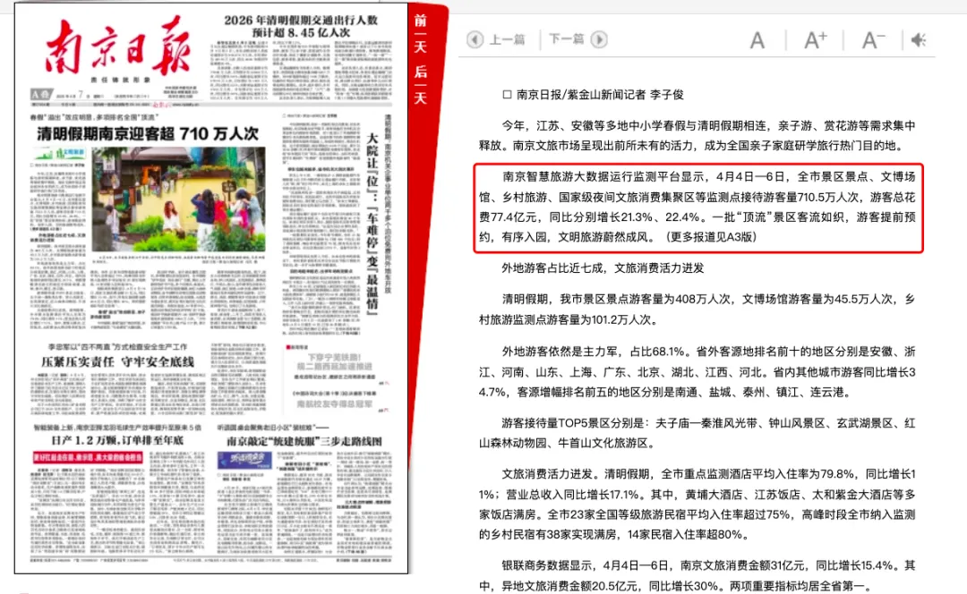 据南京智慧旅游大数据运行监测平台,4月4日-6日,南京迎客超710万人次,游客总花费77.4亿元,同比分别增长21.3%、22.4%。