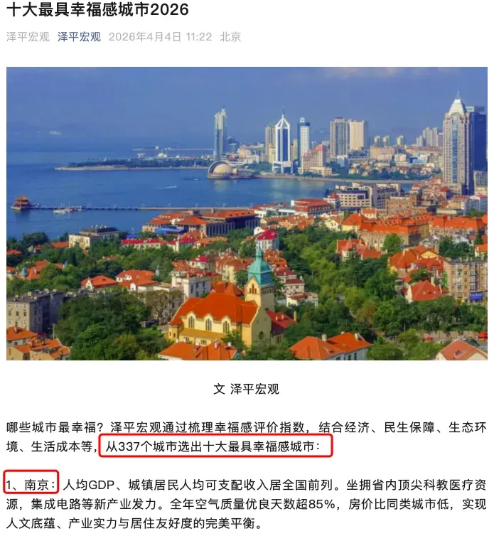 最近,泽平宏观发布了《十大最具幸福感城市2026》,在337个城市中,南京排名第一!