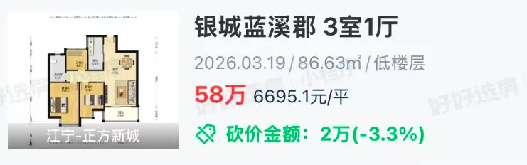 比如,江宁正方新城的银城蓝溪郡,最新成交单价6700元/平,50多万总价就能买到一套三房