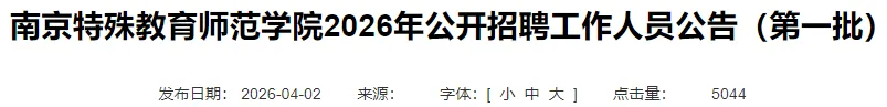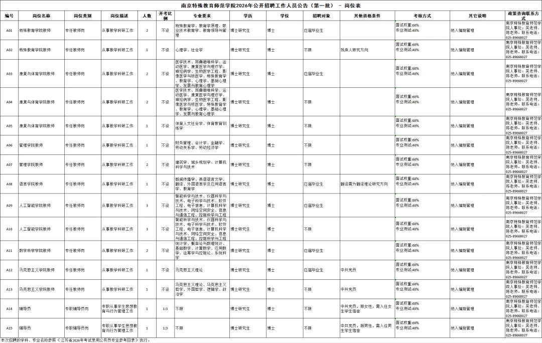 是中国唯一一所独立设置、以培养特教师资为主,兼以残疾人高等教育和残疾人事业专门人才培养的公办普通本科高校,是中国残疾人联合会和江苏省人民政府共建单位,是省教育厅主管的全额拨款事业单位。位于江苏省南京市栖霞区神农路1号。为更好地选拔优秀适岗人才,充实人才队伍,优化师资结构,南京特殊教育师范学院现面向社会公开招聘优秀人才。根据《江苏省事业单位公开招聘人员办法》等规定,现将有关事项公告如下:(一)具有中华人民共和国国籍,遵守中华人民共和国宪法和法律。(二)遵纪守法,品行端正,团结协作,敬业乐群、廉洁奉公。(四)岗位1-13为专任教师岗,年龄要求为:博士研究生年龄不超过40周岁(即1986年1月1日之后出生),具有副高级专业技术职称的年龄不超过45周岁(即1981年1月1日之后出生),具有正高级专业技术职称的年龄不超过50周岁(即1976年1月1日以后出生)。1.年龄不超过40周岁(即1986年1月1日之后出生)。2.中共党员(含中共预备党员,入党时间截至招聘报名之日)。主要学生干部包括:班长及以上职务,含班级(团支部、党支部)班长(书记),院系学生会(团委、研究生会、社联)部长正职及以上职务,校学生会(团委、研究生会、社联)部长副职及以上职务。专职从事思想政治工作是指在党的基层委员会、总支部委员会、支部委员会担任专职书记、副书记,或在纪检和党办、组织(人事)、宣传、统战等党的工作部门中专职从事思想政治工作,或在工会、共青团、妇联专职从事思想政治工作,以及专职从事思想教育或职业道德建设工作。(六)具备报考岗位要求的专业、技能等资格条件(详见岗位表)。本次招聘的应届毕业生须于2026年8月31日前毕业并取得学历学位证书,且仍无工作单位;国(境)外同期毕业人员,须在2026年8月31日前完成教育部留学服务中心学历认证。2024年、2025年普通高校毕业生,以及国(境)外同期毕业且已完成学历(学位)证书认证的人员,如报名时无工作单位,可应聘面向2026年毕业生岗位。聘用后有关事项按国家规定办理。(七)取得祖国大陆普通高校学历的台湾学生和取得祖国大陆承认学历的其他台湾居民应聘时按国家和我省有关规定执行。应聘人员通过“江苏省属事业单位公开招聘平台”报名,照片上传和资格初审,均通过网络同步进行。报名网址:https://rs.jshrss.jiangsu.gov.cn/index/f/RCRS_0056(江苏省人力资源和社会保障厅网上办事服务大厅)(1)报名、照片上传:4月7日9∶00-7月8日16∶00;(2)资格初审:4月7日9∶00-7月9日16∶00;(3)陈述申辩:4月7日-7月10日期间9∶00-16∶00;(4)对初审异议的处理:4月7日9∶00-7月10日18∶00。(1)报名、照片上传:4月7日9∶00-4月20日16∶00;(2)资格初审:4月7日9∶00-4月21日16∶00;(3)陈述申辩:4月7日-4月22日期间9∶00-16∶00;(4)对初审异议的处理:4月7日9∶00-4月22日18∶00。(1)应聘人员网上提交报名信息24小时后(节假日顺延)可到报名网站查询是否通过招聘部门(单位)资格初审。(2)本次公开招聘不收报名费和考试费,通过初审即报名成功。(3)未按时在网上确认报名资格和上传照片的视为报名无效。1.应聘人员按岗位要求和网上提示,如实填写有关信息,并上传本人近期免冠正面二寸(35X45毫米)证件照,jpg格式,大小为20Kb以下。招聘部门(单位)根据应聘人员提供的信息进行审核。应聘人员弄虚作假的,一经查实,即取消应聘资格。2.应聘人员在报名时,请在“考生简历(含学习经历从高中填起)”栏中按要求填写学习经历(具体学校、专业及起止年月)、工作经历(具体单位、职务及起止年月)及主要学生干部经历,未填写的视作无相关经历。岗位1-13应聘人员在报名时,请在“科研成果”栏中详细填写自己的研究方向、主要的论文著作(注明期刊名称,年、期和起止页码,并标明是第一作者或独立作者或通讯作者〔导师为第一作者〕等信息)、研究课题(注明主持或参与以及排名、科研经费等信息)和科研奖励(注明排名、奖励级别等信息)等情况,未填写论文及课题情况的视作无相关科研成果。应聘人员在报名时,须在“材料信息”栏中上传招聘要求的相关材料扫描件,具体如下:(2)取得证书的须提供自高中之后各学习阶段学历、学位证书和学信网出具的有效期内《教育部学历证书电子注册备案表》《中国高等教育学位在线验证报告》,取得国(境)外学历学位证书的须提供教育部中国留学服务中心的认证证书;未取得证书的须提供学信网学籍验证报告或其他学籍证明材料。(3)2026年毕业生提供所在院校出具的省级教育行政部门统一印制的《毕业生双向选择就业推荐表》和未签署的毕业生就业协议书(或未网签证明)。(4)岗位1-13应聘人员须按照填写的报名信息提供学术成果、奖励证书、专业技术职务资格证书等岗位要求的其他相关证明材料;岗位14-15应聘人员须按照填写的报名信息提供中共党员证明、学生干部或工作经历证明等岗位要求的其他相关证明材料。(1)中共党员证明须为近六个月内由考生所在学校或单位的组织部门或院系党委出具的证明;(2)院级及以下主要学生干部经历证明须由院系或院系党委(不含院系团委)出具,校级主要学生干部经历证明须由校团委、校学生管理部门出具;(3)应聘人员提供的所有材料、各单位开具的应聘人员证明材料均须真实有效。经查实有弄虚作假行为的,对应聘人员立即取消应聘和录用资格或解除聘用合同。