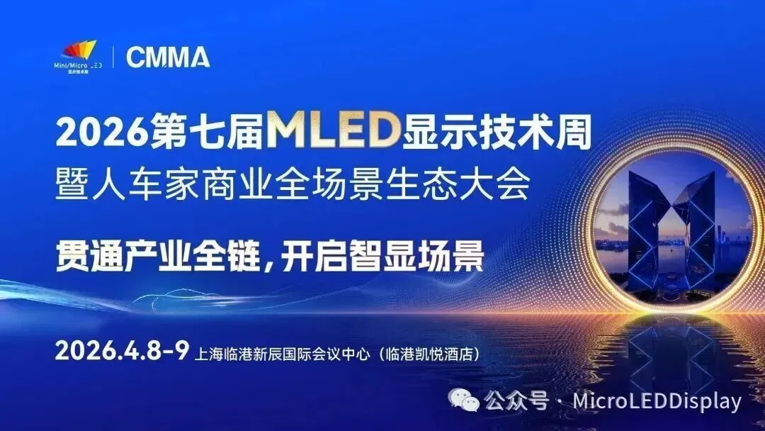2026第七届MLED显示技术周暨人车家商业全场景生态大会将于2026年4月8-9日在上海临港新辰国际会议中心召开,大会将汇聚100+产业链企业的150余位高层领导、演讲及对话嘉宾,近500位产业人士,举办多场CMMA工作组闭门研讨会、大会主题演讲、行业深度对话、2026MLED全生态春季集中发布活动及优秀产业链企业参观活动,搭建集政策解读、技术研讨、商业对接、生态共建于一体的产业级交流平台。