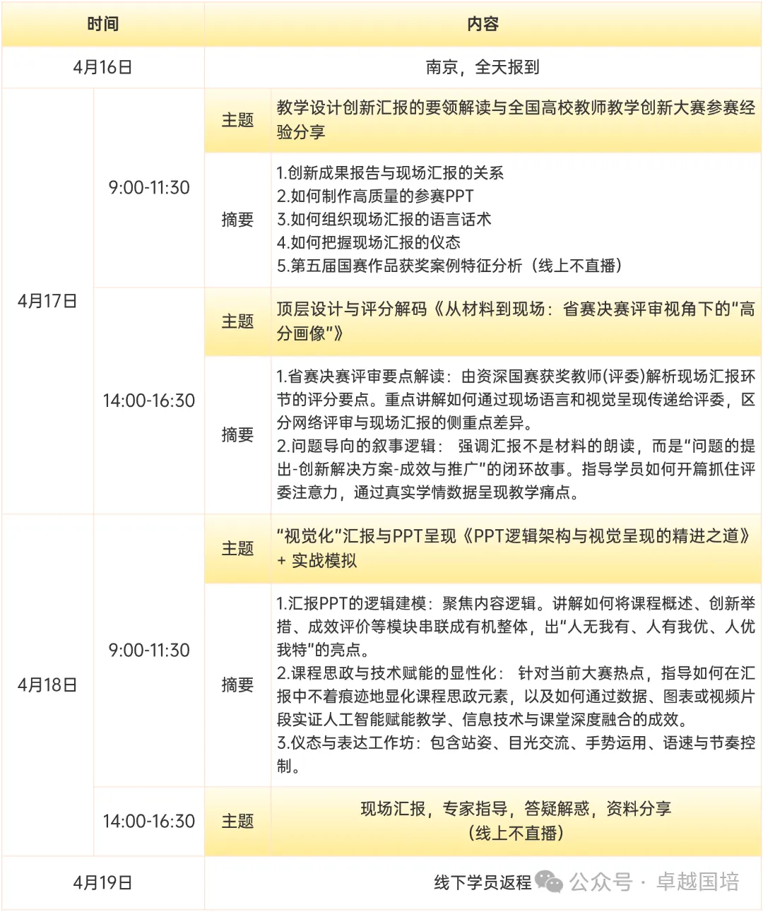 为助力高校教师积极备赛第六届高校教师教学创新大赛“省赛”之“教学设计创新汇报”,掌握“教学设计创新汇报”的核心关键与展示要点,卓越国培特举办本期特训班。