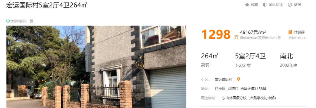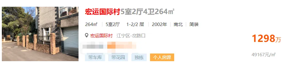 某二手房网站上,小区别墅房源仅有1套挂牌——建面约264㎡,总层高2层,5室2厅设计,挂牌总价1298万。可见约200㎡以上的独栋别墅不仅鲜少在市场流通,置业总价也在千万以上。对比来看,今日被疯抢的这套约224㎡的独栋别墅,不仅是周边稀缺房源,且373万的起拍价格,对买房人的诱惑力也直接拉满。哪怕是最终以799万的价格成交,相对市场挂牌价来讲,也有近500万的价差,买家直接“捡漏”。0231人哄抢、激战130轮,这套房子到底有什么魅力呢?我们接下来看看小区本身。宏运国际村位于江宁区岔路口宏运大道1158号,由南京宏运房地产开发有限公司开发,房龄已超20年,是南京较早的一批商品房别墅区。