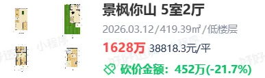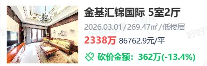 小区独栋别墅产品暂无成交记录,挂牌房源也仅有1套,稀缺性不言而喻;且这套挂牌房源总价近1300万,单价约4.9万/㎡,比同小区其他类型房源的置业门槛,高出不少。