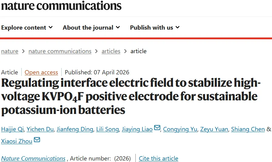 2026年04月07日,南京师范大学周小四、廖家英团队在Nature Communications期刊发表题为“Regulating interface electric field to stabilize high-voltage KVPO4F positive electrode for sustainable potassium-ion batteries”的研究论文,团队成员戚海杰为论文第一作者,周小四、廖家英为论文共同通讯作者。