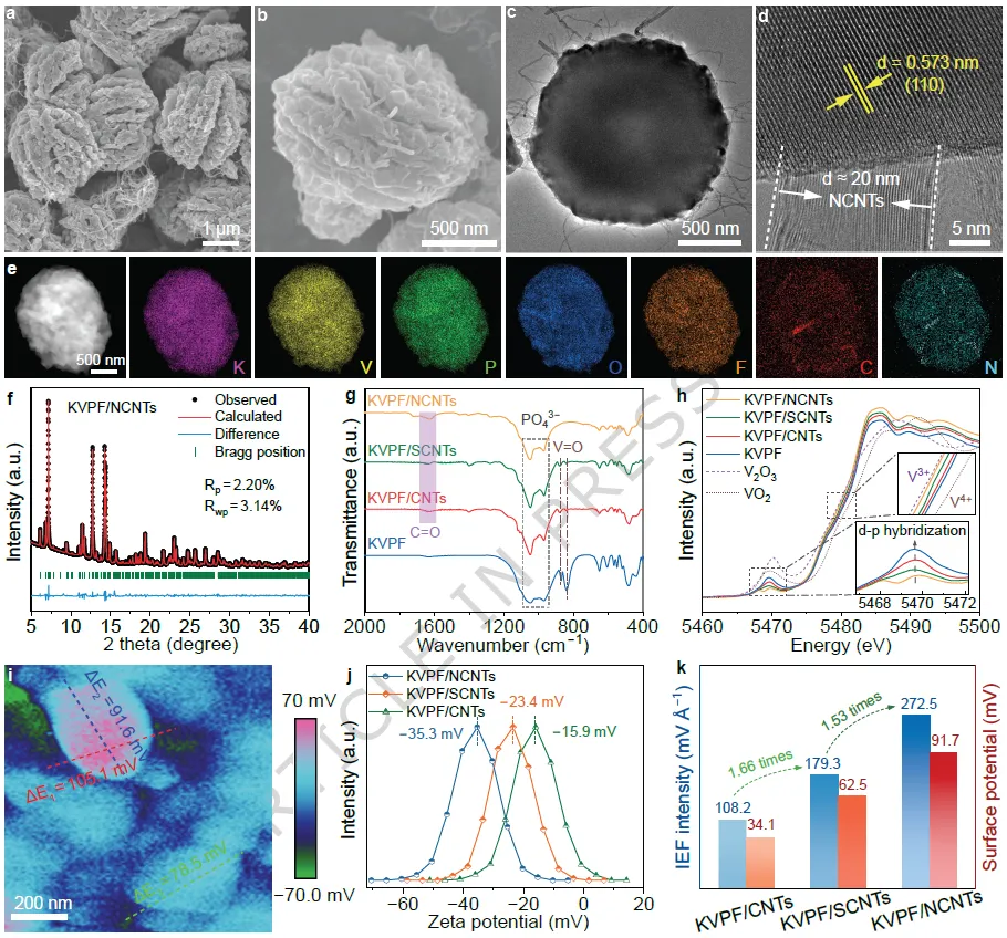 图2 | 微观形貌、结构与IEF表征。a–e,KVPF/NCNTs的SEM图像(a,b)、TEM图像(c)、HRTEM图像(d)和元素分布图像(e)。f,KVPF/NCNTs的Rietveld精修SRXRD图谱。g,h,KVPF样品的FTIR光谱(g)和V K-edge XANES光谱(h)。i,KVPF/NCNTs的SKPM图像。j,KVPF样品的Zeta电位。k,KVPF样品的IEF强度和表面电位。