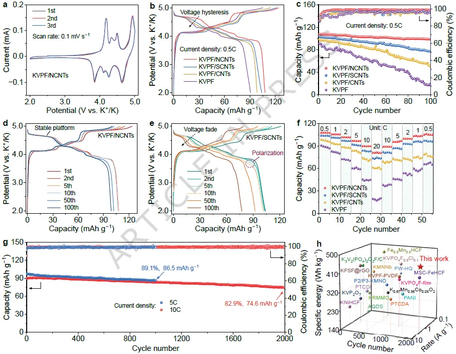 图3 | KVPF样品的储钾性能。a,KVPF/NCNTs的前三圈CV曲线。b,c,KVPF样品在0.5C下的恒流充放电曲线(1C = 131 mA g⁻¹)(b)和循环性能(c)。d,e,KVPF/NCNTs(d)和KVPF/SCNTs(e)在0.5C下选定循环圈数的相关充放电曲线。f,KVPF样品的倍率性能。g,KVPF/NCNTs的长期循环性能。h,KVPF/NCNTs与多种PIB正极材料的电化学性能比较。