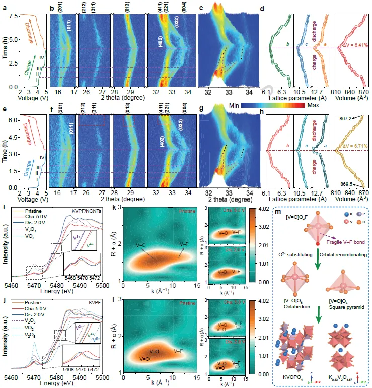 图4 | 结构演变与K⁺传输动力学。a,e,KVPF/NCNTs(a)和KVPF(e)在0.2C下的电压曲线。b,f,KVPF/NCNTs(b)和KVPF(f)的原位XRD图谱二维等高线图。c,g,KVPF/NCNTs(c)和KVPF(g)在31.5°–35.5°范围内的原位XRD图谱三维等高线图。d,h,基于原位XRD图谱得到的KVPF/NCNTs(d)和KVPF(h)的晶格参数与体积变化。i,j,KVPF/NCNTs(i)和KVPF(j)在0.5C首圈不同充放电状态下的V K-edge XANES光谱。k,l,KVPF/NCNTs(k)和KVPF(l)在0.5C首圈不同充放电状态下的V K-edge WT-EXAFS结果。m,KVPF在循环过程中结构退化示意图。